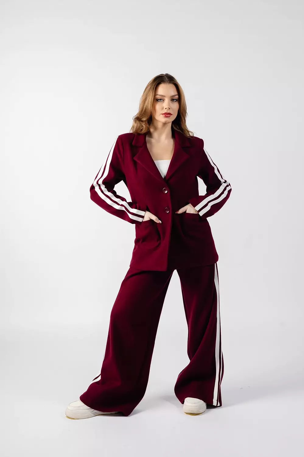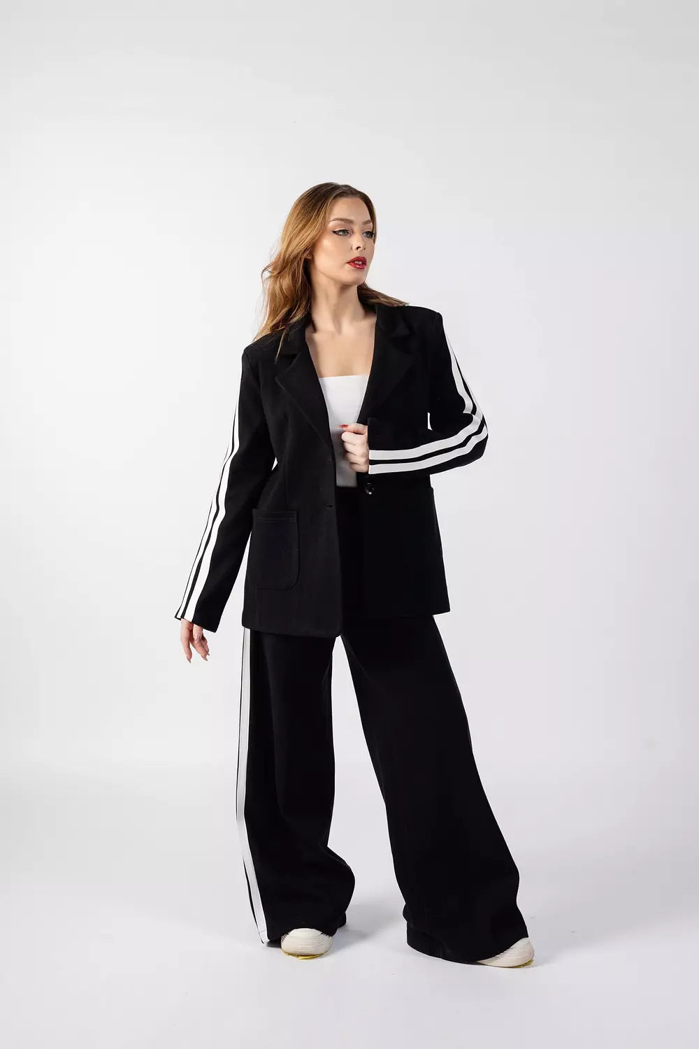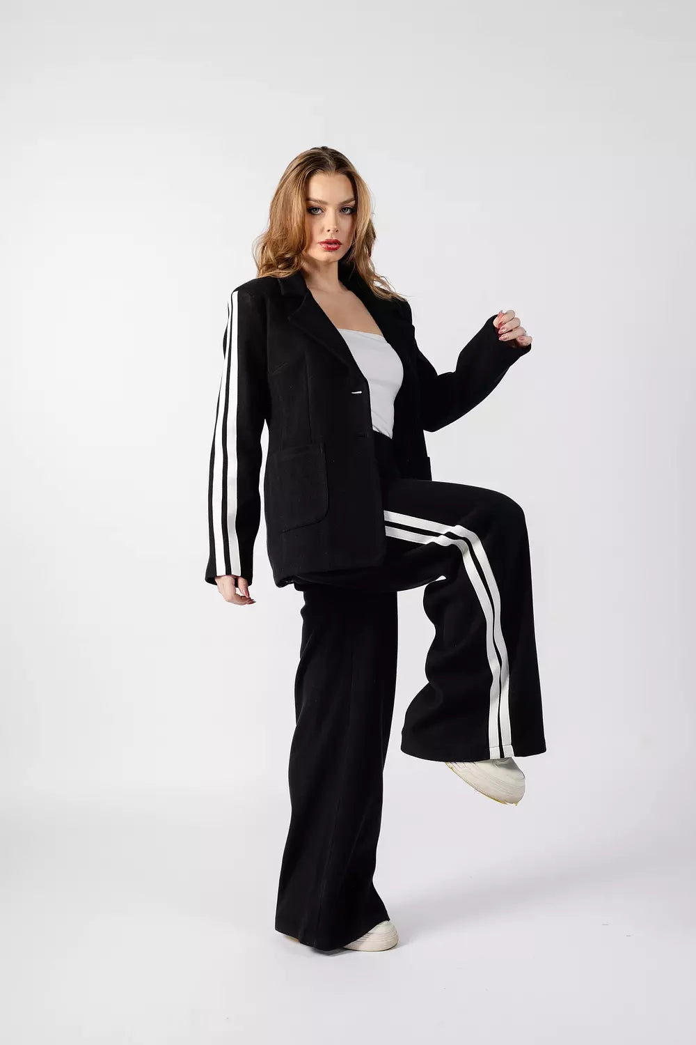 Details: Blazer-style jacket with wide-leg pants and side stripes