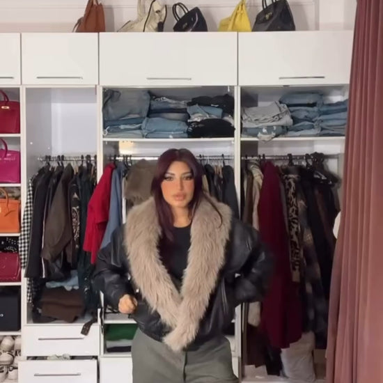 Crafted from premium leather-effect fabric and finished with a soft faux fur collar, this jacket delivers warmth and comfort with a clean, chic silhouette.