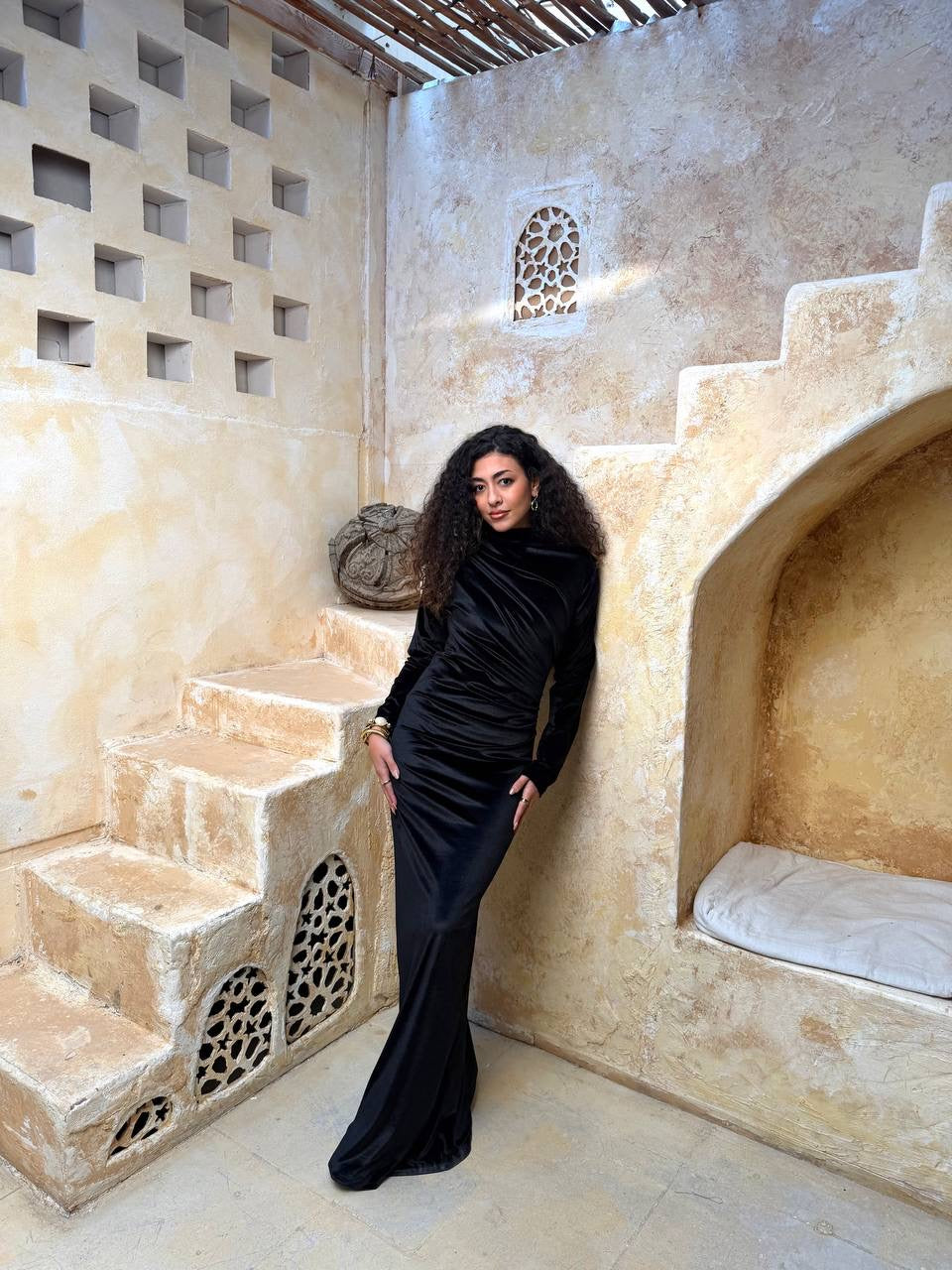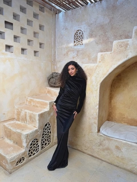 • Style: Long fitted velvet dress with elegant draped neckline and sleek silhouette