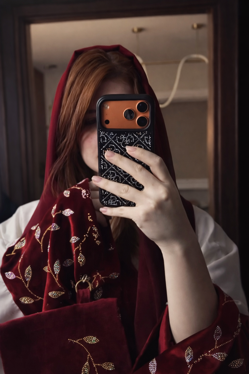 This stunning kaftan features luxurious velvet sleeves with delicate leaf embroidery, paired with a matching velvet bag for a perfectly coordinated look.🌸