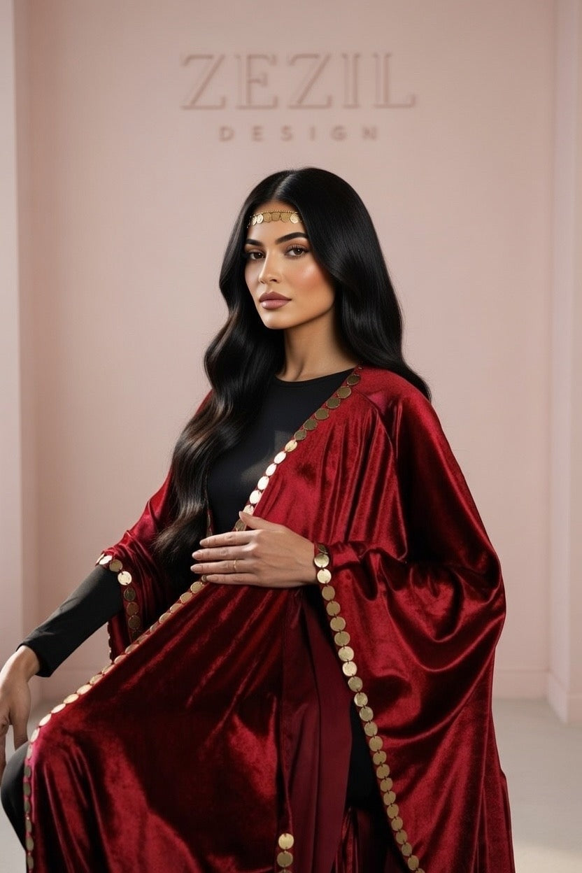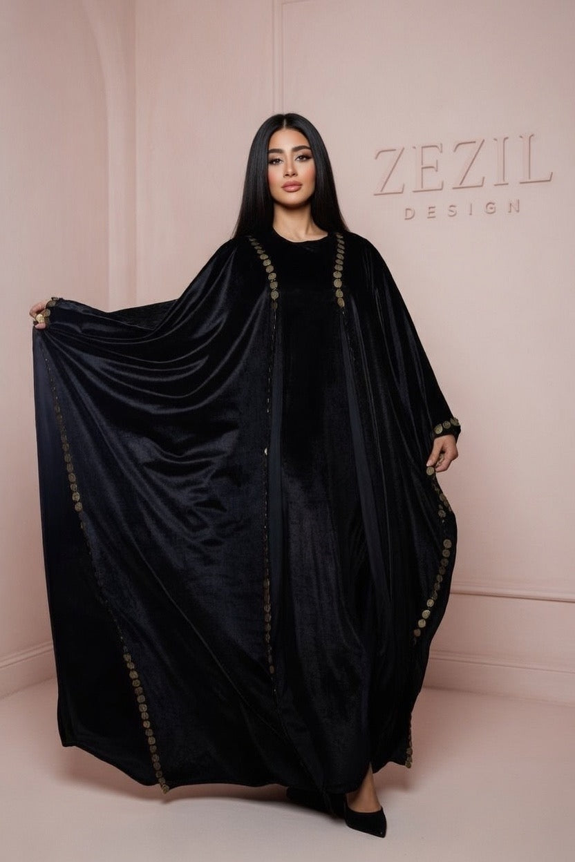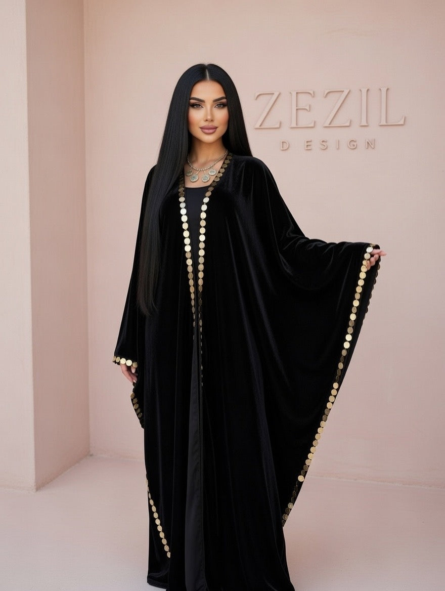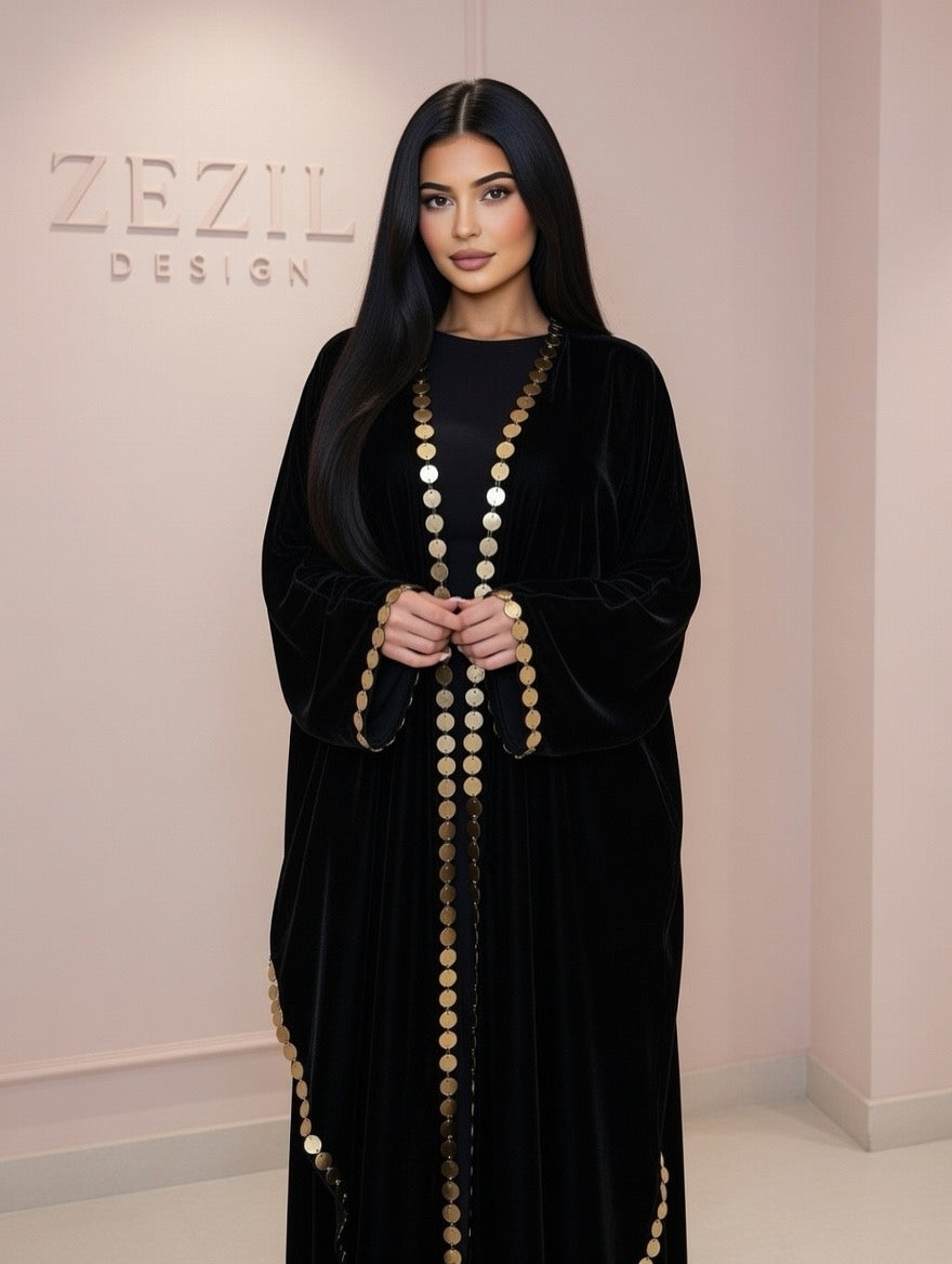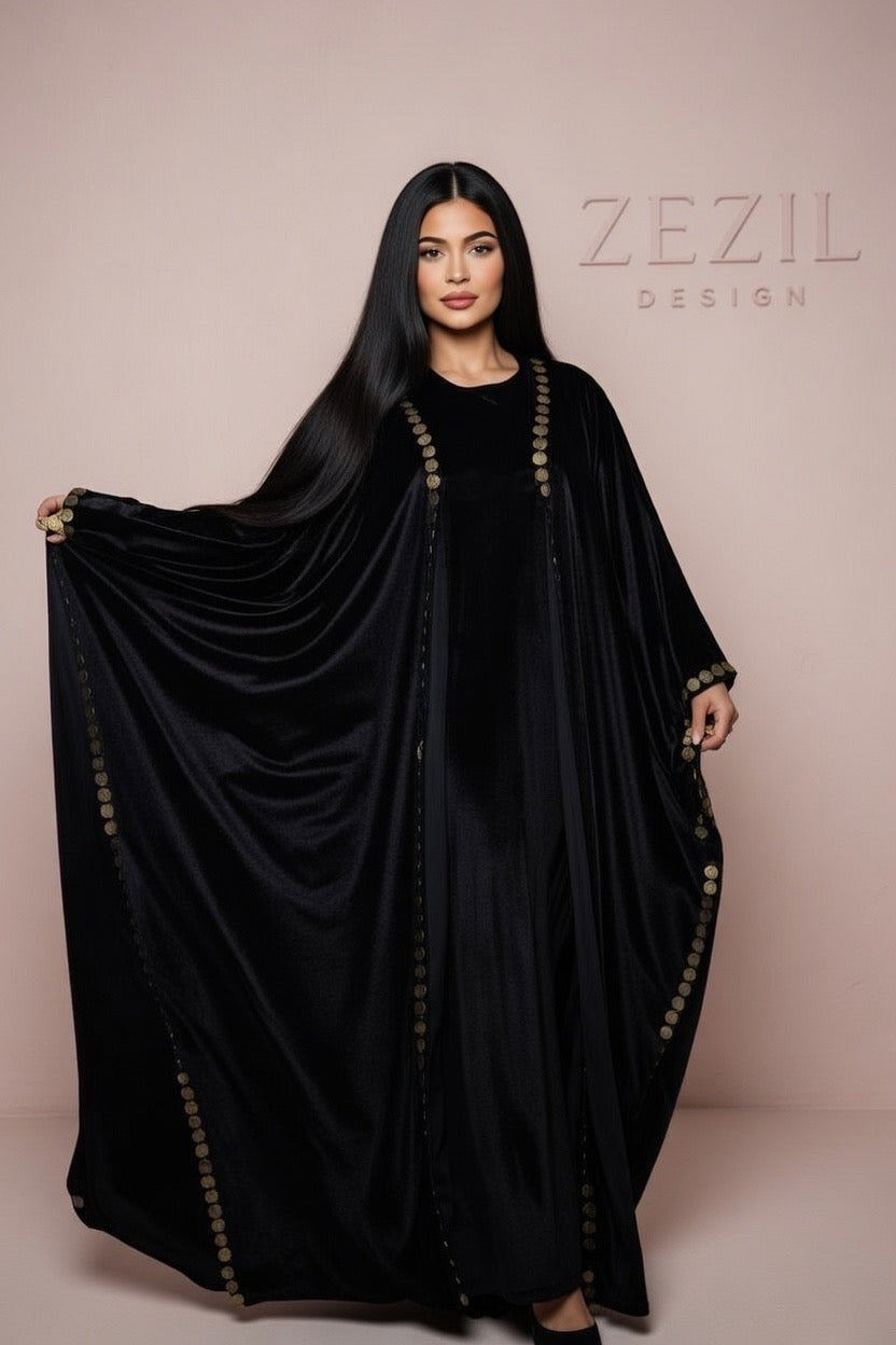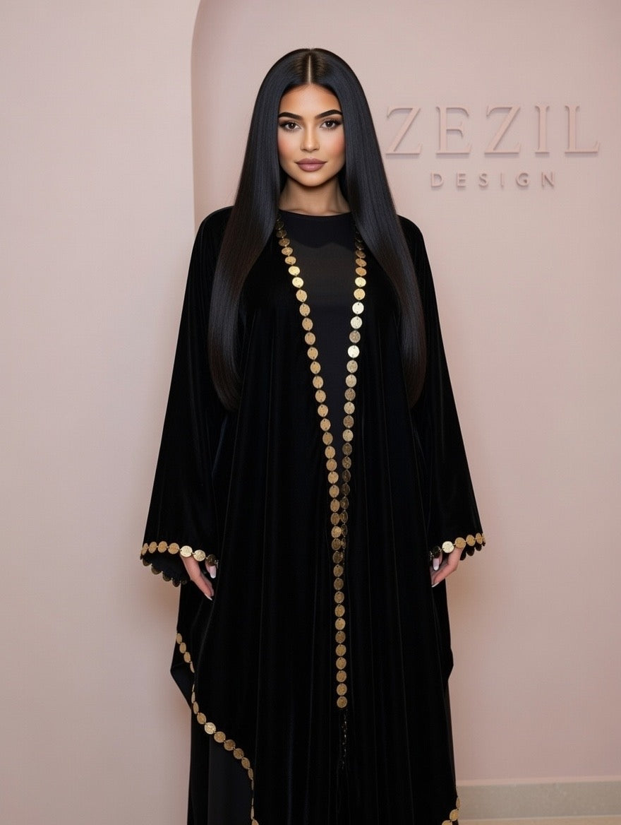 Luxury velvet abaya with elegant handmade gold coin detailing ๐ค