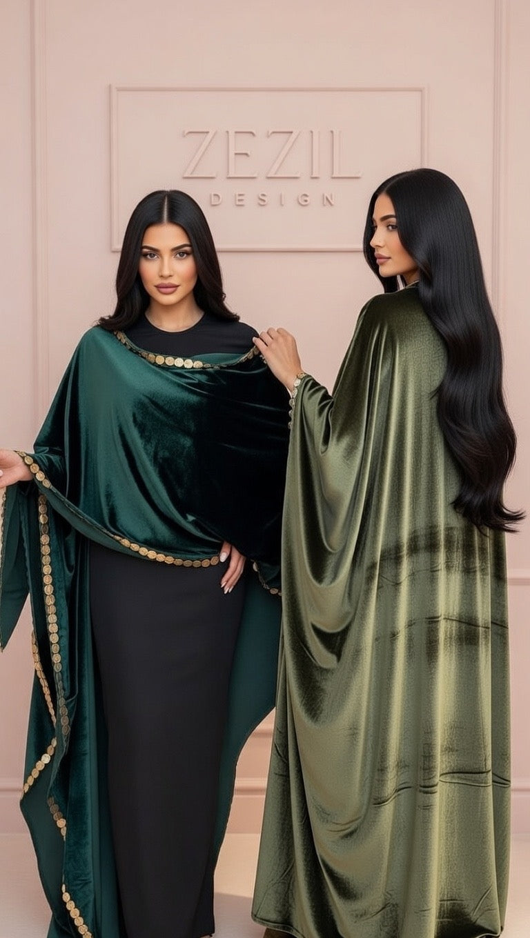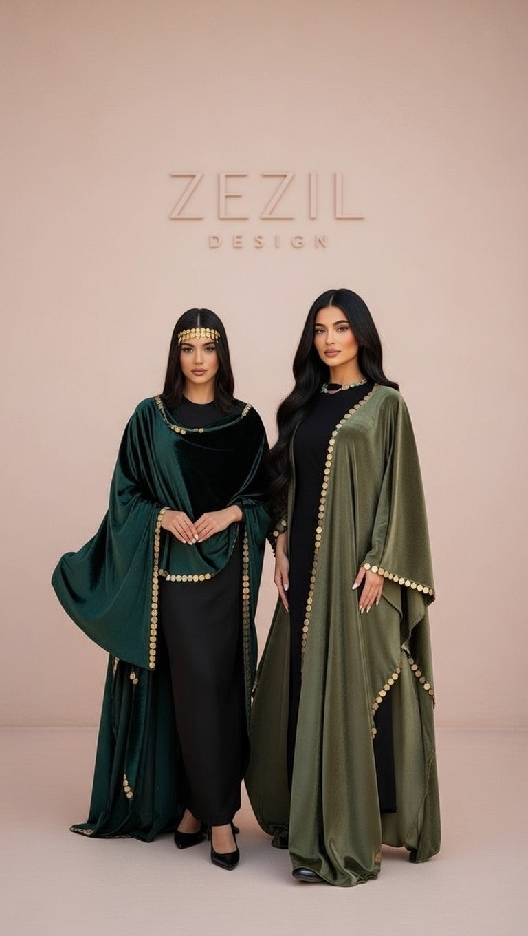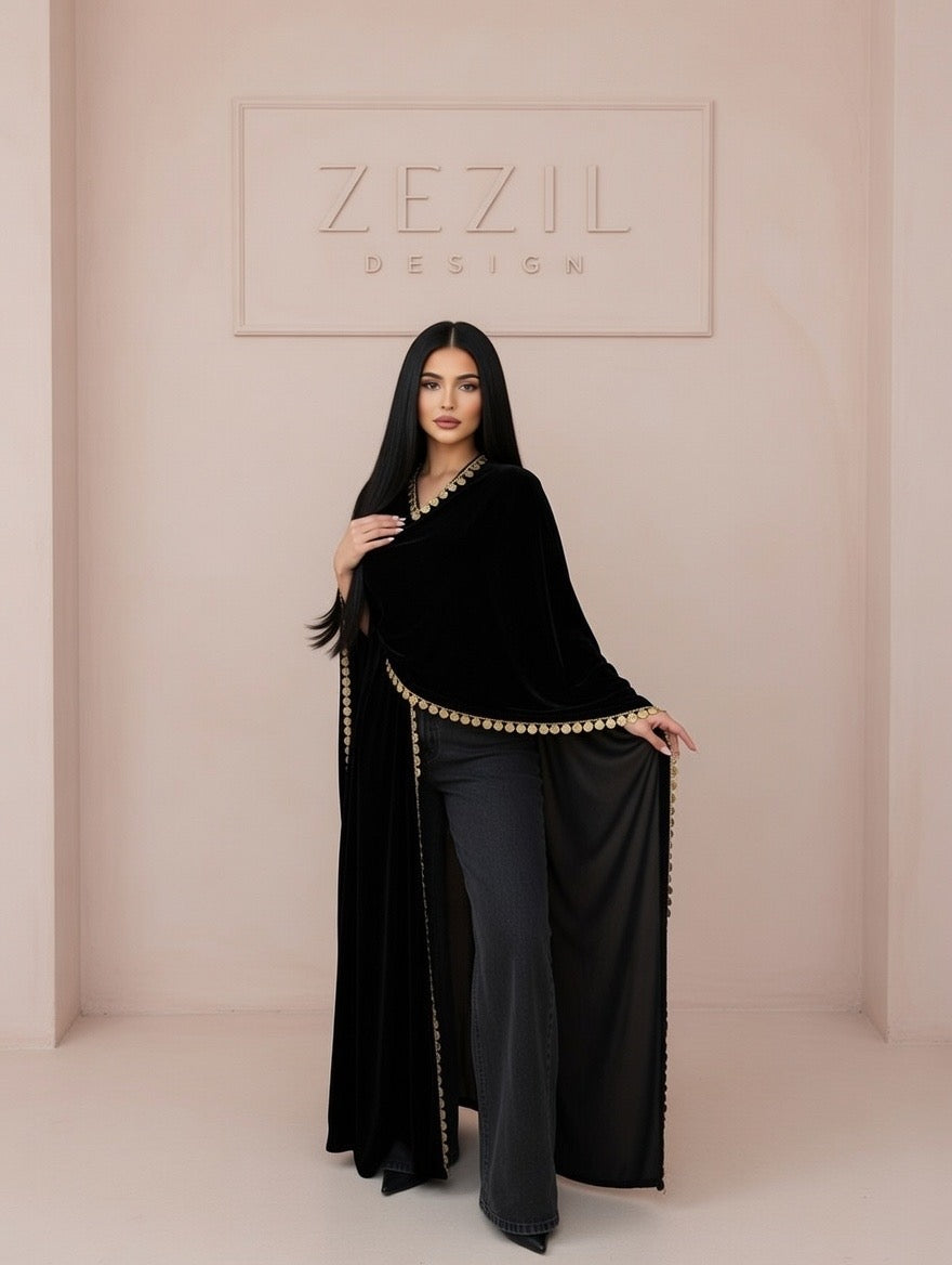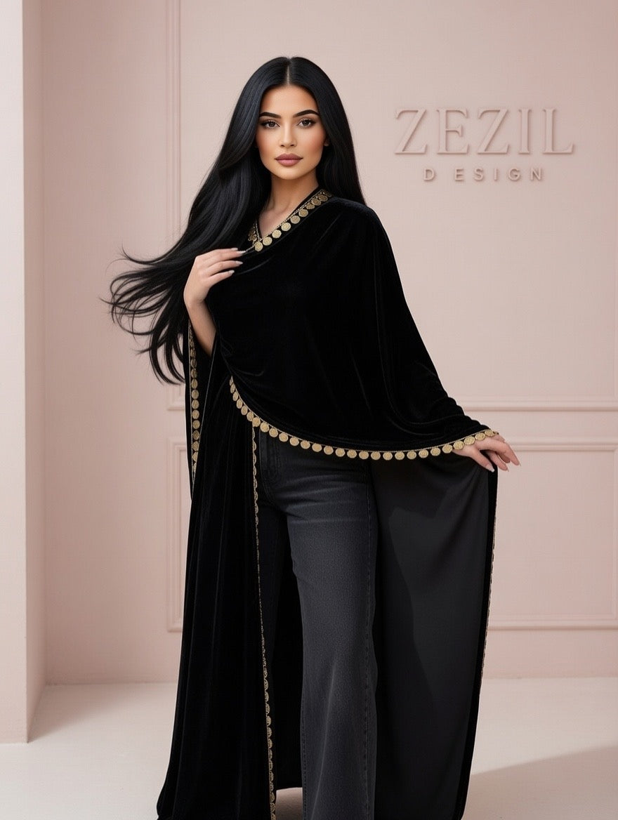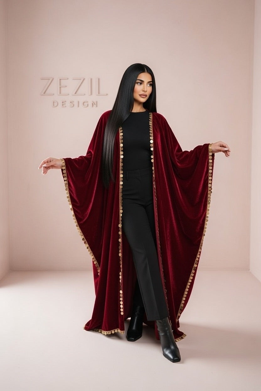 Luxury velvet abaya with elegant handmade gold coin detailing ๐ค